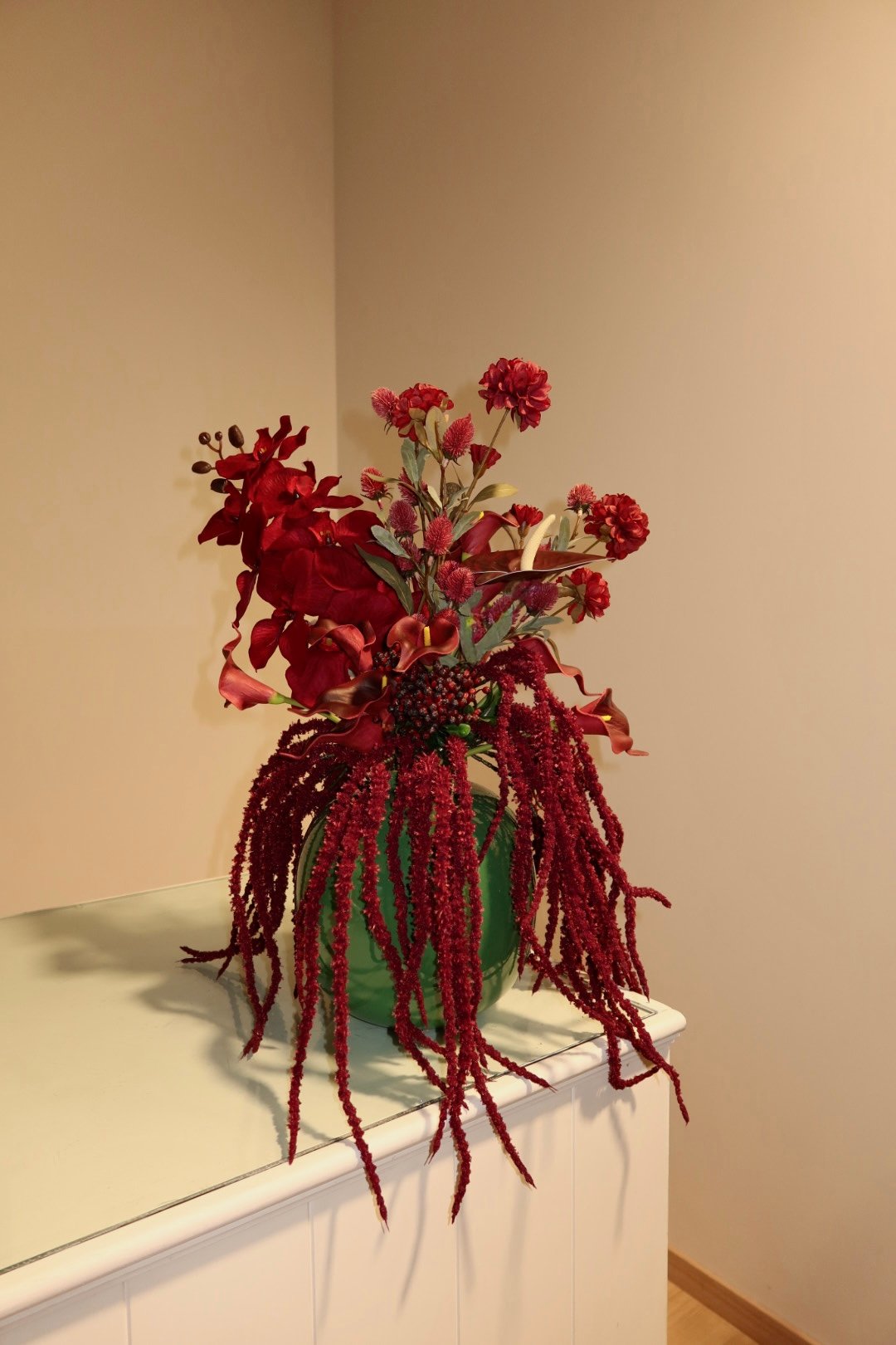 Het boeket Winefall is een uitgesproken en luxueus arrangement met opvallende, hangende takken in diepe bordeaux tinten. De rijke kleur en speelse vormgeving geven het boeket een elegante, bijna dramatische uitstraling. Perfect als statement piece in een vaas en ideaal voor wie houdt van een warm, stijlvol en exclusief interieuraccent.